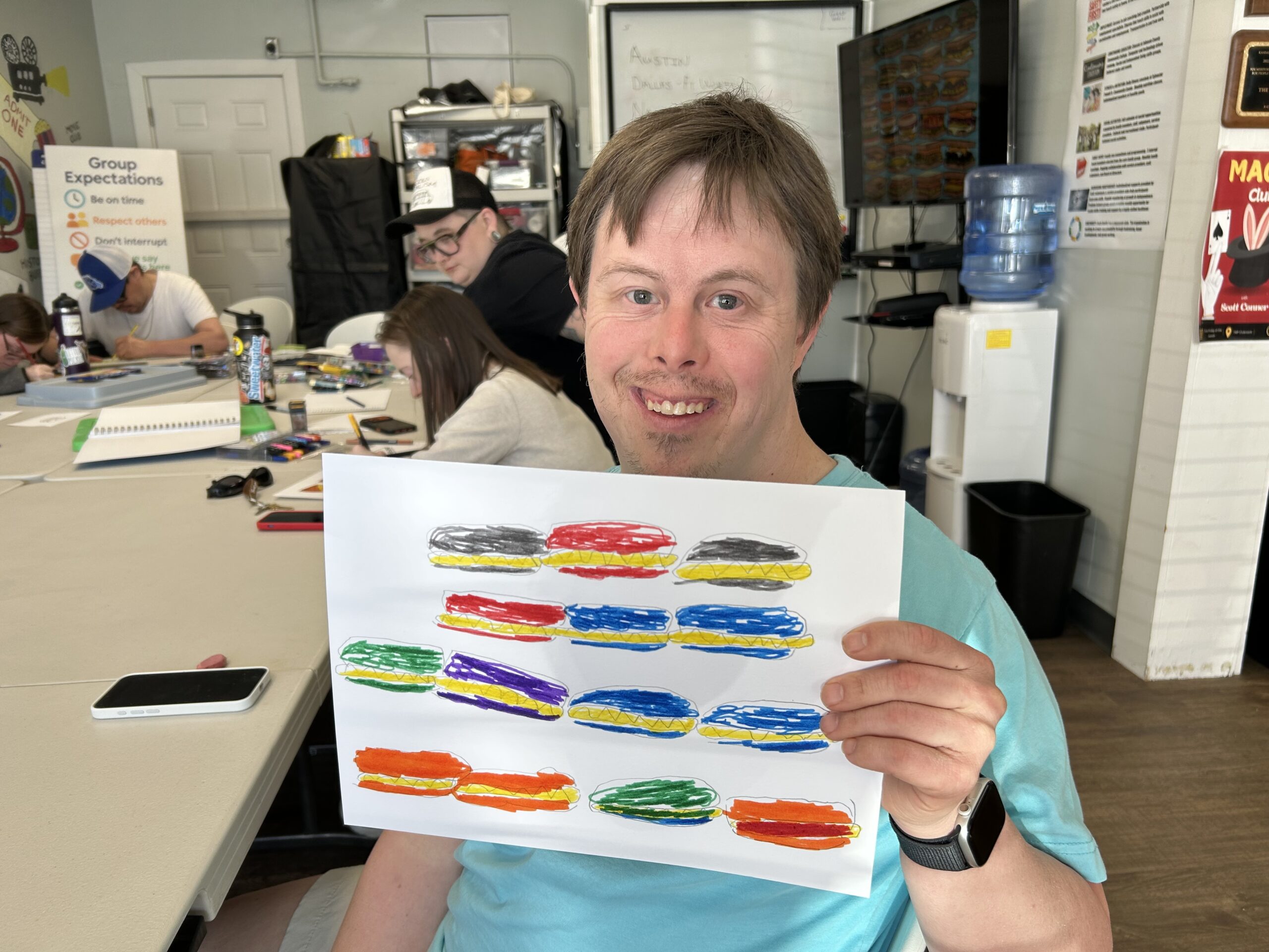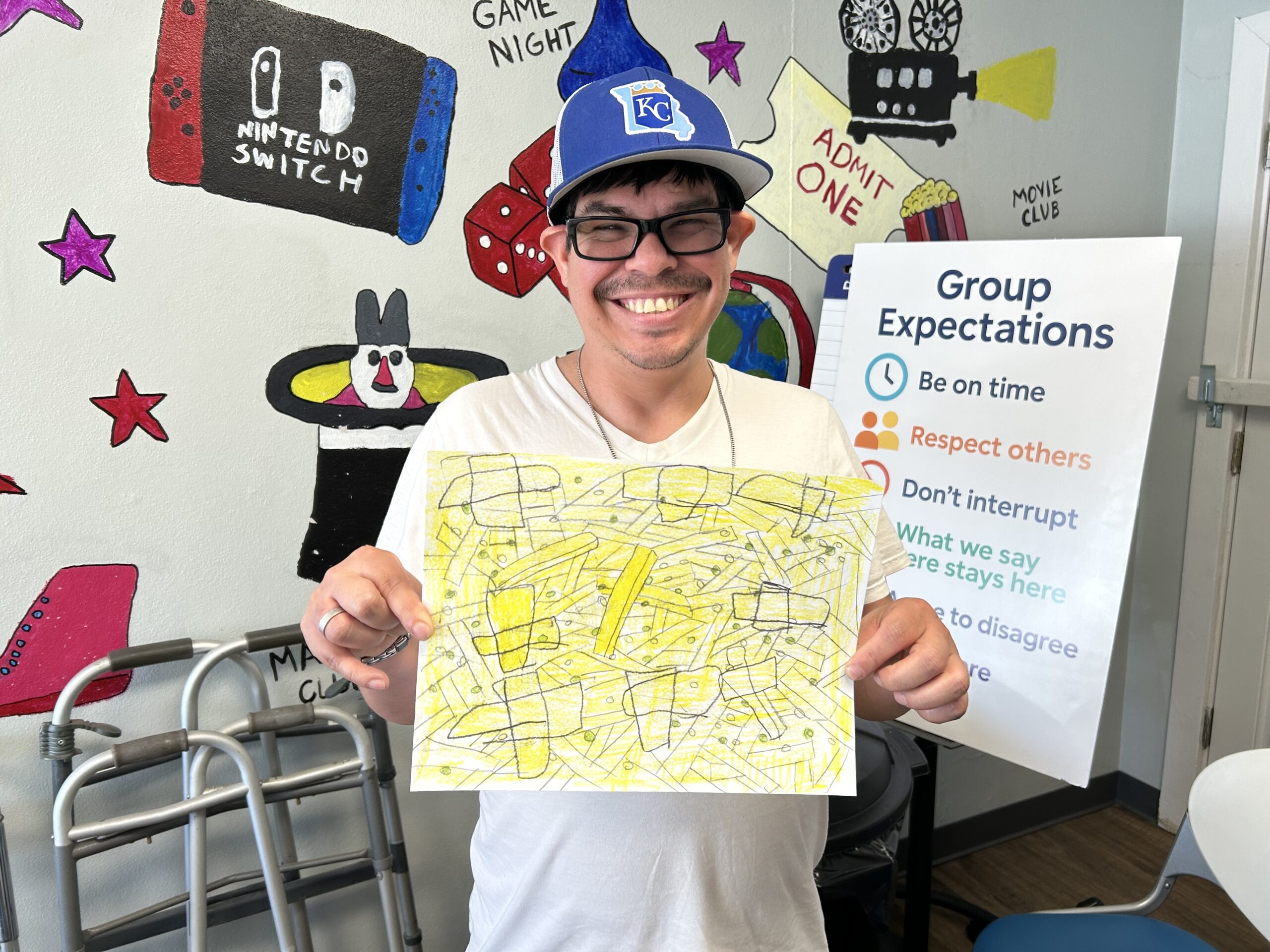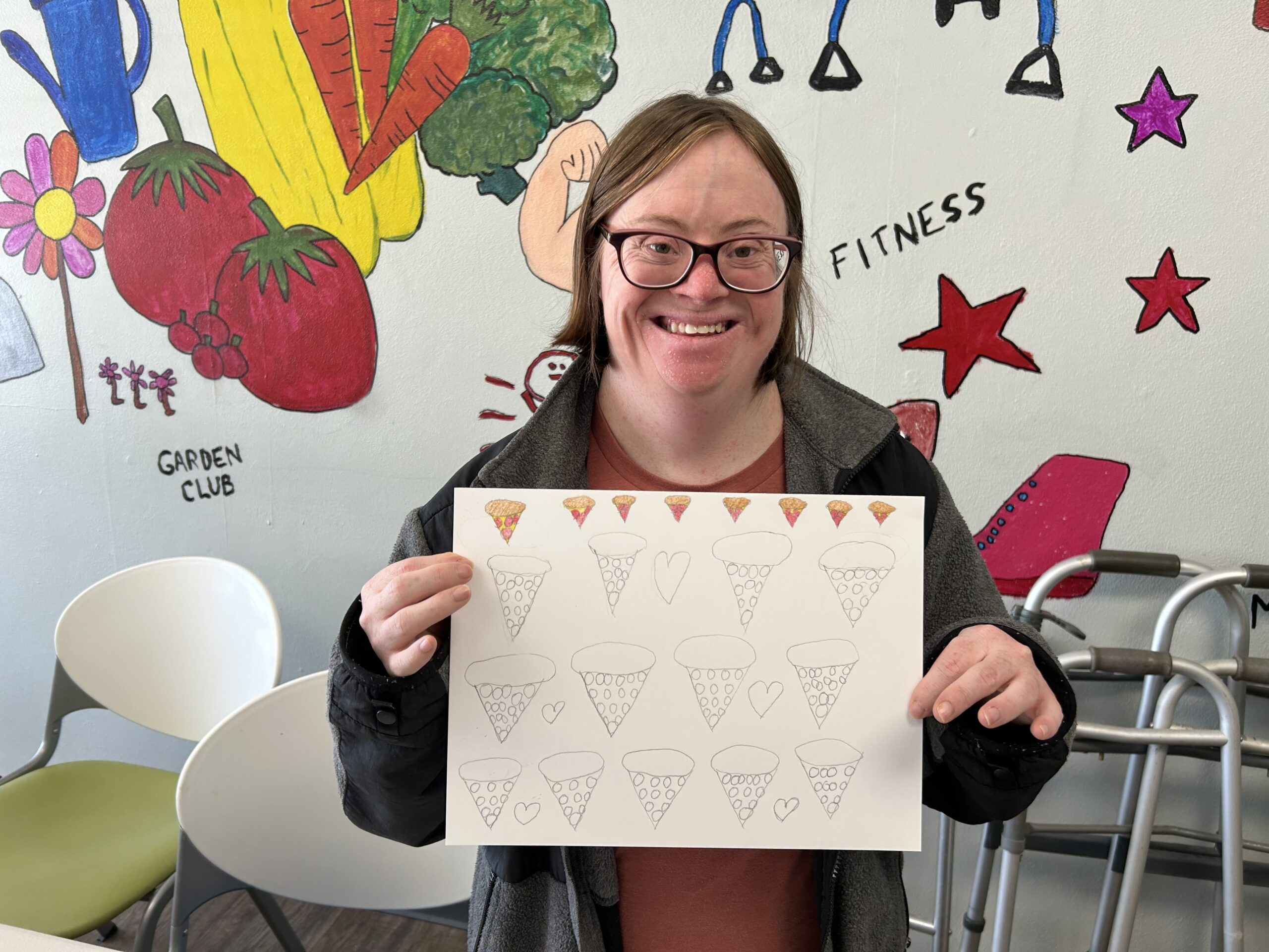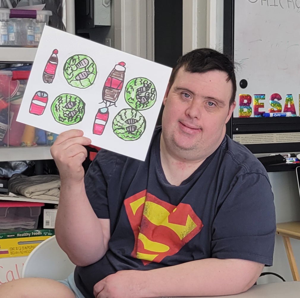 During this session, participants drew inspiration from Allen Yu, a young artist with autism known for his vibrant, pattern-based drawings featuring animals, fruit, candy, and other joyful subjects. Allen’s bold use of color and intricate design patterns encouraged our participants to explore their own creativity in new ways.