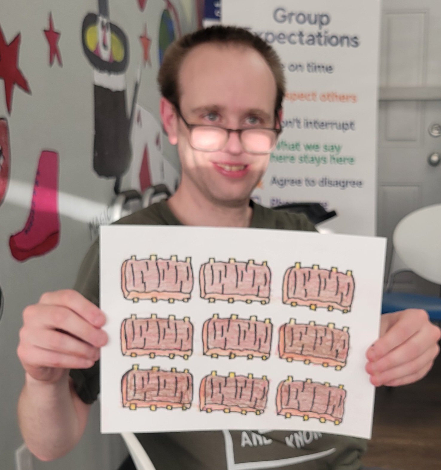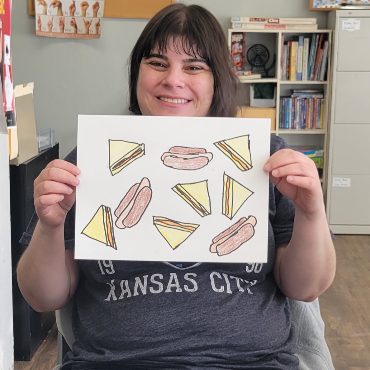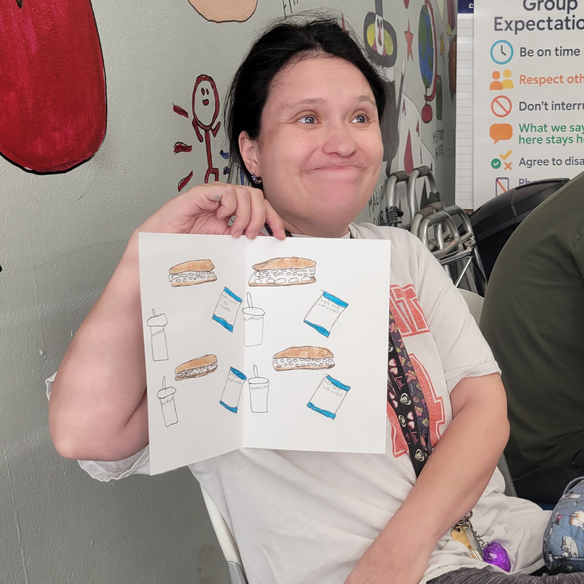 During this session, participants drew inspiration from Allen Yu, a young artist with autism known for his vibrant, pattern-based drawings featuring animals, fruit, candy, and other joyful subjects. Allen’s bold use of color and intricate design patterns encouraged our participants to explore their own creativity in new ways.
